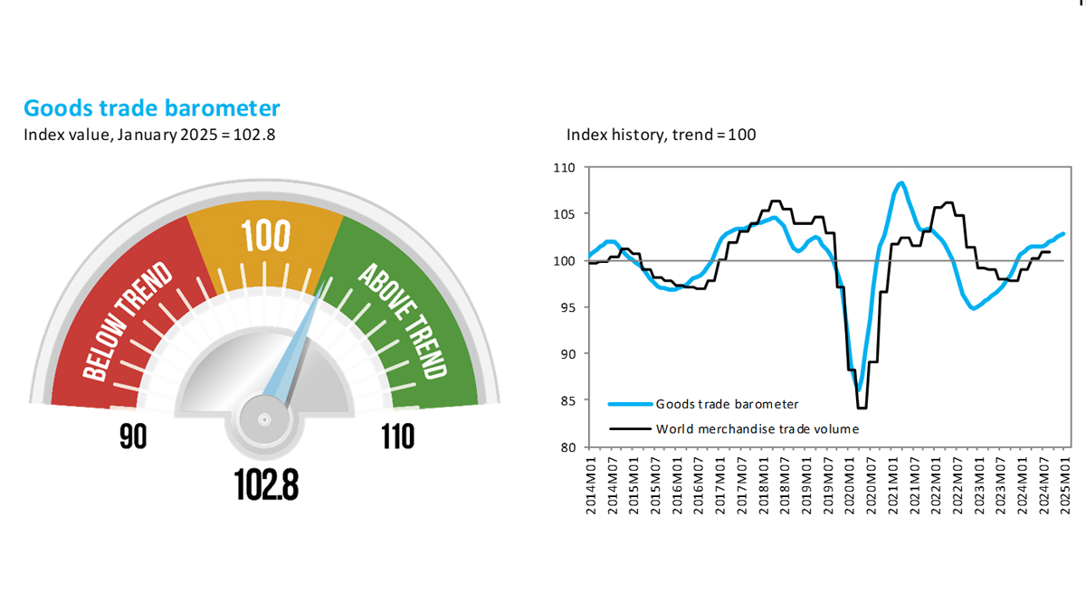 The WTO’s Goods Trade Barometer edged up slightly to 102.8, nearly unchanged from December’s 102.7 (a barometer reading above 100 indicates trade volume is above trend, while below 100 suggests trade is falling short of or will soon fall below trend).
